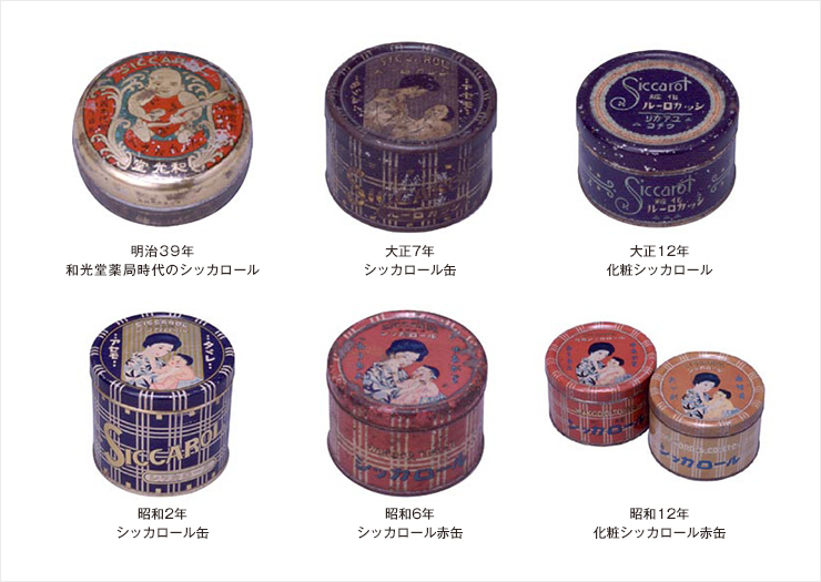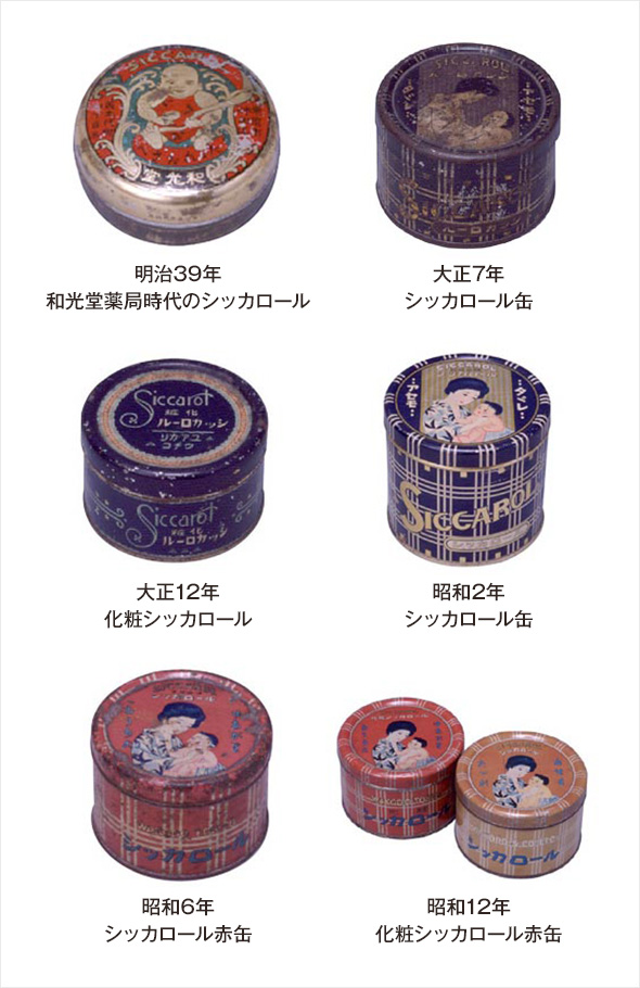 発売当時は金太郎の腹巻をした子どもがシッカロールを持っている図柄でしたが、その後は母親に抱かれた赤ちゃんにシッカロールをつけているポーズとなりました。同じポーズですが、母親の髪型と着物(wù)の図柄は時代の移りかわりを敏感に表しています。例えば、髪型は二百三高地から、大正中期の丸まげ、昭和の束髪、洋髪、パーマネントと変わっていきました。そして、赤ちゃんの写真をあしらったデザイン、現在の文(wén)字だけのデザインへと引き継がれています。
