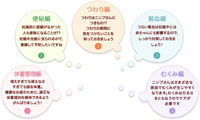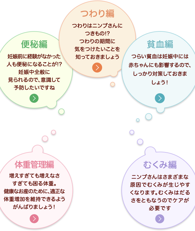 妊娠中のつわりでお悩みの方へ│妊婦さんのお食事ガイド 妊娠中の便秘でお悩みの方へ│妊婦さんのお食事ガイド 妊娠中の貧血でお悩みの方へ│妊婦さんのお食事ガイド 妊娠中の体調管理でお悩みの方へ│妊婦さんのお食事ガイド 妊娠中のむくみでお悩みの方へ│妊婦さんのお食事ガイド