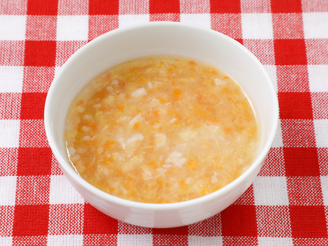 - キャベツとにんじんはやわらかくなるまでゆで、みじん切りにします。じゃがいもはやわらかくなるまでゆですり鉢ですりつぶします。野菜のゆで汁はとっておきます。