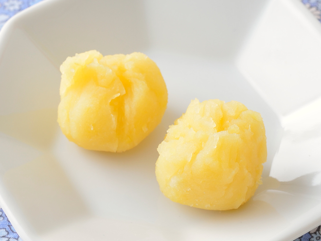 - 熱いうちに15mlのお湯で溶いた「飲みたいぶんだけ りんご果汁」を混ぜ合わせラップ等で茶巾しぼりをつくります。