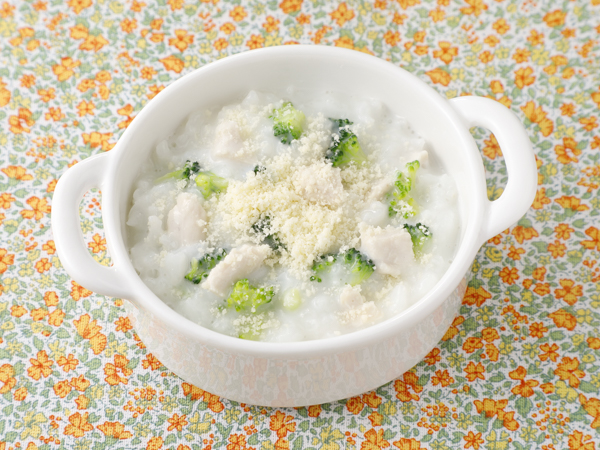 - (2)に軟飯と牛乳を加えて混ぜながら煮込み、粉チーズをかけます。