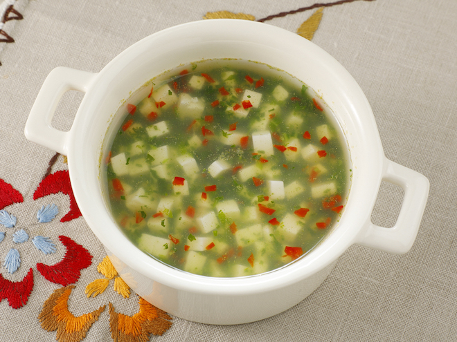 1. 赤ピーマンは皮をむき、チンゲン菜と一緒にやわらかくなるまでゆで、細かく刻みます。豆腐は3~5mmのさいの目に切ります。