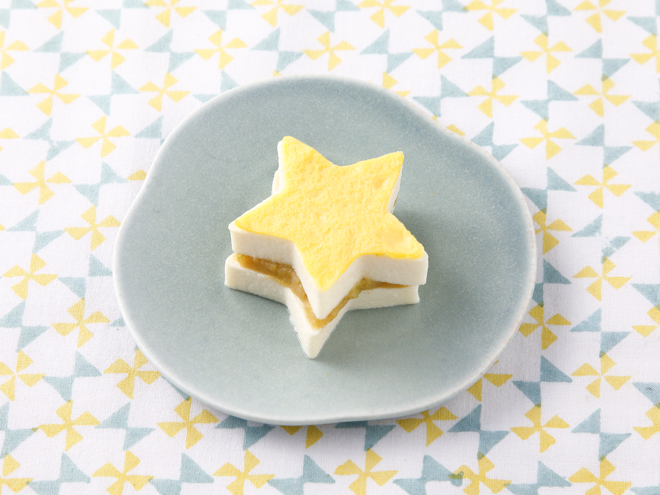 - 豆腐をゆでて水けを切り、型などで抜いて2個にしサンドできるようにします。